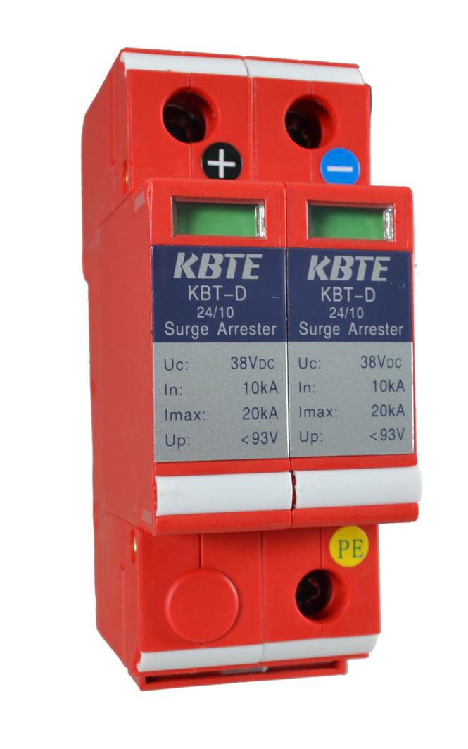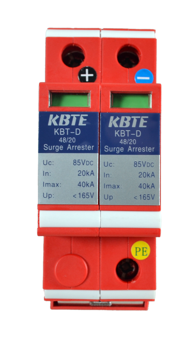 KBT-D系列直流电源防雷模块为分体式结构,可插拔,带劣化指示窗口。用于直流电源第三级防护,标准35mm导轨安装。采用并联安装方式,不影响电源线路的正常工作。